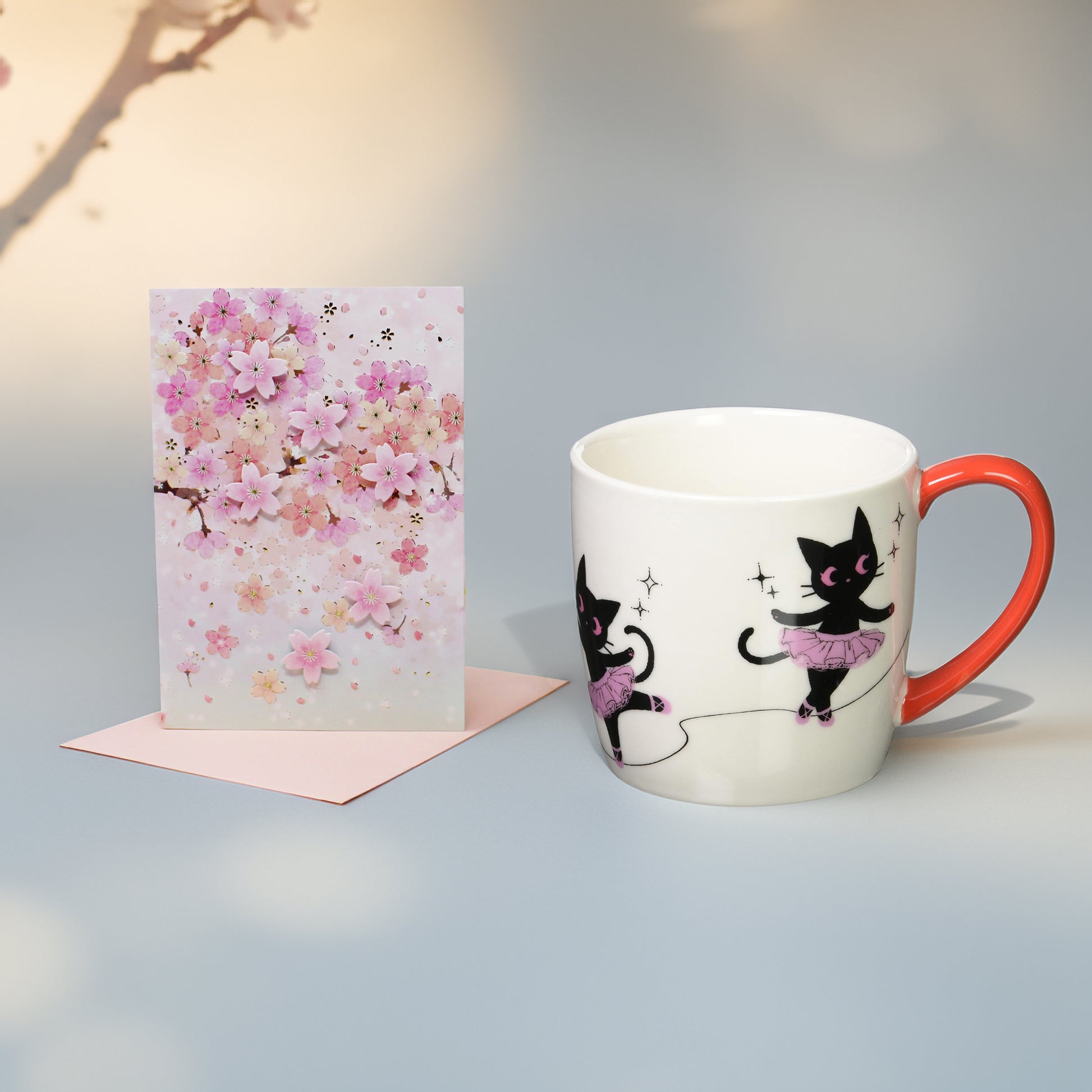 Cat Lover Valentine Gift Set – Ropi Ballet Mug + Cherry Blossom Embossed Card